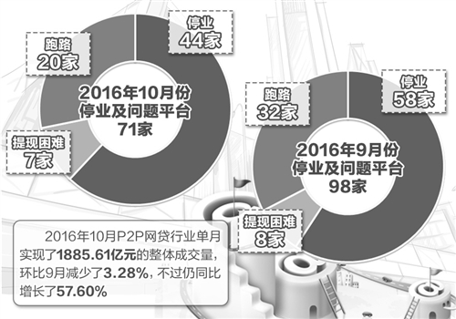 “今年‘合规自律’是网贷行业的主旋律,监管办法出台后,目前行业平台都在向合规靠拢,加强自律。一些不合规的平台也在谋求转型或是主动停业。”恒昌公司有关负责人表示。据网贷之家联合盈灿咨询发布的数据显示,2016年9月份停业及问题平台共计98家,其中问题平台40家(跑路32家、提现困难8家),停业平台58家(停业57家、转型1家)。
