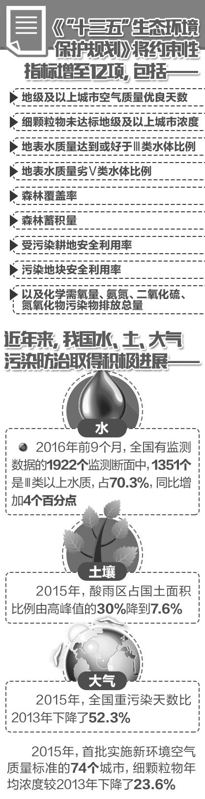 值得注意的是,在“十三五”规划《纲要》提出的10项约束性指标基础上,此次《规划》又增加了受污染耕地安全利用率、污染地块安全利用率两项约束性指标。至此,“十三五”阶段生态环境保护的约束性指标达到12项,分别是地级及以上城市空气质量优良天数、细颗粒物未达标地级及以上城市浓度、地表水质量达到或好于Ⅲ类水体比例、地表水质量劣Ⅴ类水体比例、森林覆盖率、森林蓄积量、受污染耕地安全利用率、污染地块安全利用率,以及化学需氧量、氨氮、二氧化硫、氮氧化物污染物排放总量。