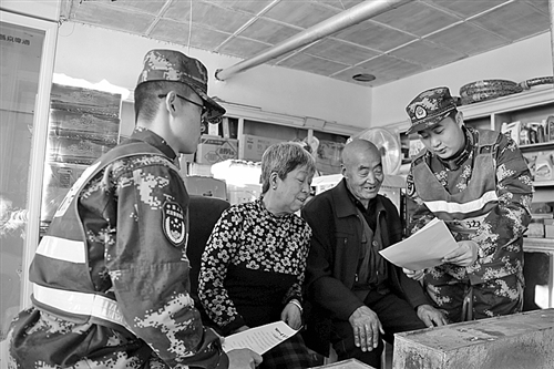 11月17日一早,内蒙古边防总队四子王旗边防大队脑木更边防派出所官兵,深入4000多平方公里的边境管理区,走包串户向牧民发放神舟安保宣传单,宣传讲解神舟飞船着陆前后的安全注意事项,同时发动牧民群众排查、消除存在的安全隐患。白生云摄
