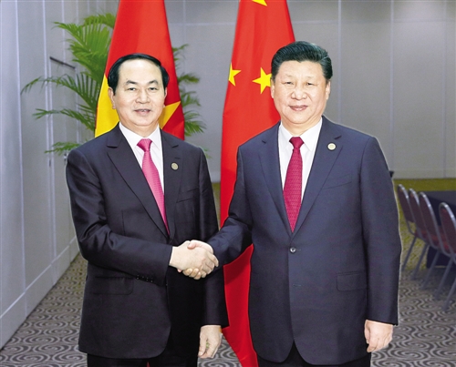 习近平强调,中越是山水相连的友好邻邦,拥有广泛共同利益。中越双方要牢牢把握中越关系发展正确方向,落实好高层共识,实施好业已商定的项目,推动中越关系持续健康稳定发展,造福两国人民。新形势下,双方要保持高层往来,就双边关系和共同关心的问题及时沟通。要用好现有合作机制,不断提升务实合作质量和水平,加快推进跨境经济合作区建设和基础设施合作项目,推动产能合作取得早期收获。要通过双边协商对话解决争议,坚持走搁置争议、共同开发的合作之路,妥善处理问题,维护南海和平稳定。