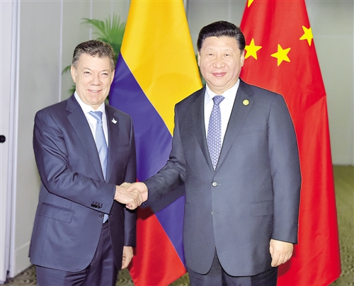 习近平指出,中方赞赏并支持桑托斯总统坚定推进哥伦比亚和平进程。中方从战略高度和长远角度看待和发展同哥伦比亚关系,愿同哥方一道,落实双方合作共识,推动中哥关系迈上更高台阶。当前,中哥都处在国家建设关键时期,双方要相互支持、相互帮助,加强高层交往,保持密切沟通,鼓励和支持两国政府、立法机构、政党等往来。要扩大务实合作,加大推动重点项目力度,积极开展产能合作,实现互利双赢、共同发展。要加强多边合作,推动国际秩序朝着更加公正合理的方向发展。