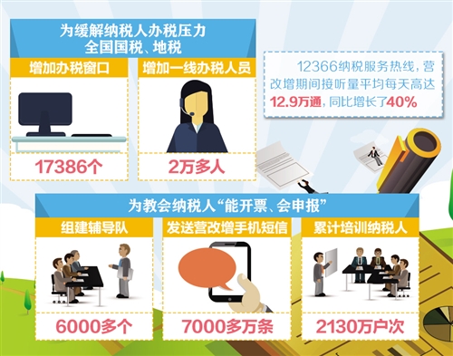 这只是营改增“放管服”中的一个缩影。数据显示,为缓解纳税人办税压力,全国国税、地税增加办税窗口17386个、一线办税人员2万多人。同时,为教会纳税人“能开票、会申报”,组建辅导队6000多个,发送营改增手机短信7000多万条,累计培训纳税人2130万户次,实现了纳税人培训全覆盖。据统计,12366纳税服务热线在营改增期间的接听量,平均每天高达12.9万通,同比增长了40%。