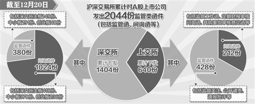 《经济日报》记者查询上交所、深交所官方网站统计显示,截至12月20日,沪深交易所累计对A股上市公司发出了2044份监管类函件(包括监管函、问询函等)。具体来看,上交所累计向上市公司下发了640份监管类函件。其中,问询函件(包括监管工作函、定期财报审核问询函、并购重组审核意见函等)共212份,监管函件(包括监管关注、公开谴责、通报批评等)共428份;深交所今年累计向上市公司下发1404份监管类函件。其中,监管函件共380份,包括深交所主板149份、中小板191份、创业板40份。此外,深交所还下发了1024份问询函件,分别向深交所主板、中小板、创业板企业下发了418份、370份和236份问询函件。