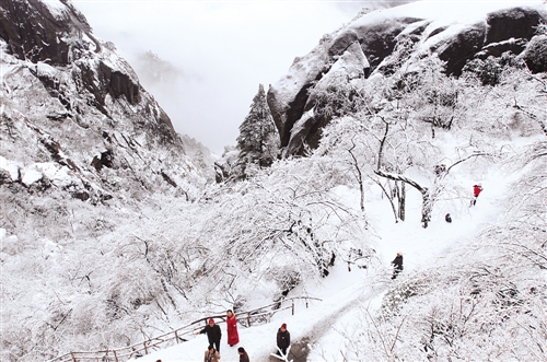 初雪的黄山,风烟一收,另是一番肃静妖娆。在西南山城重庆,金佛山的雾凇冰凌晶莹剔透,引得观光客攀山来赏。