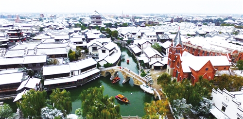 ② 山东枣庄市台儿庄古城风景区银装素裹。小桥流水,青石板路,黛瓦斗檐建筑群沉浸在雪中,美不胜收。 高启民摄