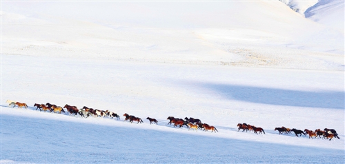 ⑦ 内蒙古赤峰市克什克腾旗,马群奔驰在雪原。 张今卓摄