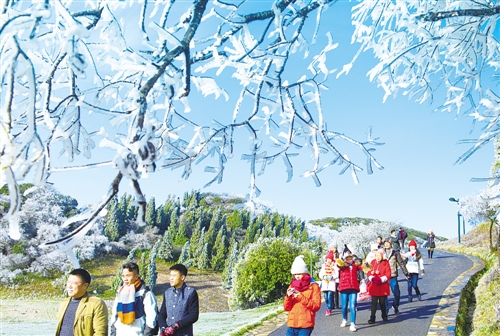 ⑨ 重庆市南川区金佛山风景区,雾凇冰凌景观吸引大批游客上山观景。 胡 波摄