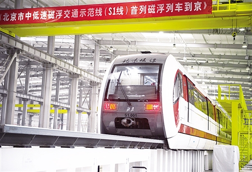 停放在北京S1线石门营车辆段的北京S1线首列磁浮列车(12月25日摄)。北京市中低速磁浮交通示范线(S1线)首列磁浮列车日前进京到达S1线石门营车辆段,之后将会启动列车调试,预计将在2017年实现载客运行。S1线是北京市首条磁浮线,西起门头沟区的石门营站,东至石景山区的苹果园站。 新华社记者 罗晓光摄