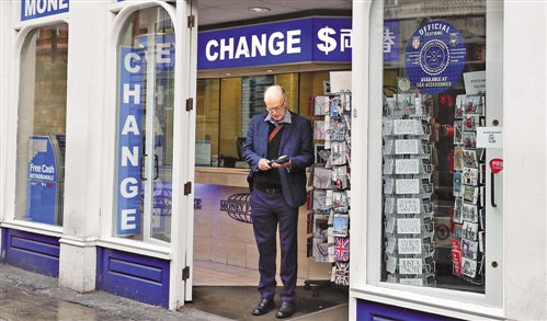 受脱欧影响,英镑走势持续低迷。图为在英国伦敦,一名男子从一家货币兑换点走出。 (新华社发)