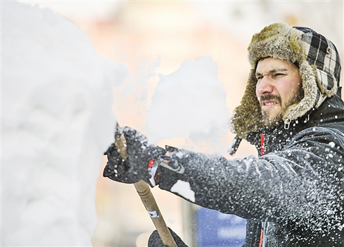 1月4日,2017第九届国际大学生雪雕大赛在哈尔滨工程大学拉开帷幕,共有来自12个国家和地区的95支高校代表队参赛。图为一名参赛者在制作雪雕。 (新华社发)