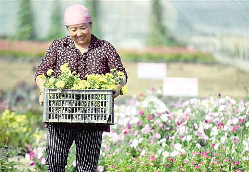 新疆伊犁伊宁县萨地克于孜乡“花惠农”合作社成员在搬运花苗。该合作社建成家庭式温室大棚260余座,共销售花卉180万株,带动320多名村民实现人均年增收近4000元。