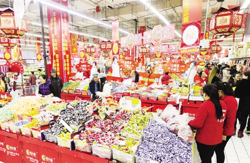 上图 1月29日,市民在北京欧尚超市挑选年货。春节期间,北京各大商场各种年货供应充足。本报记者 李树贵摄