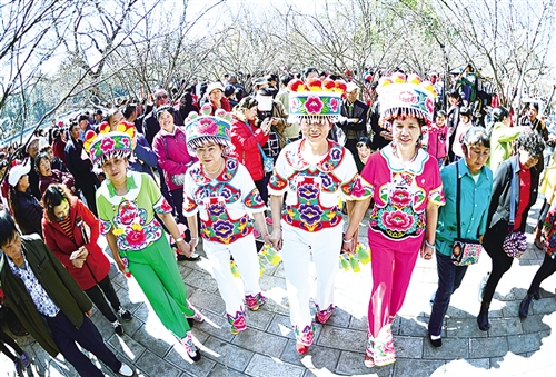 大年初二,云南昆明市翠湖公园少数民族市民载歌载舞庆祝春节。 本报记者 高兴贵摄
