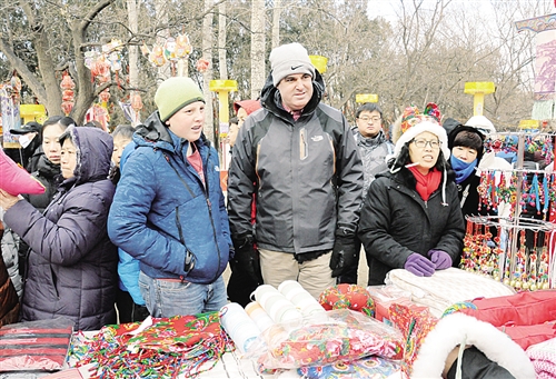 在北京地坛庙会上,极具特色的中国传统文化活动吸引了许多“老外”驻足。 本报记者 朱 磊摄