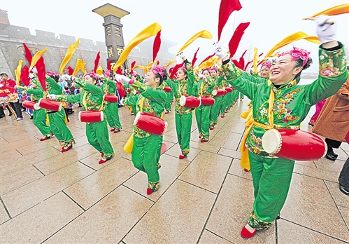 1月29日,江苏省东台市唐洋镇群众在西溪宋城广场扭起秧歌,打起腰鼓,喜迎新春。 严海长摄(新华社发)