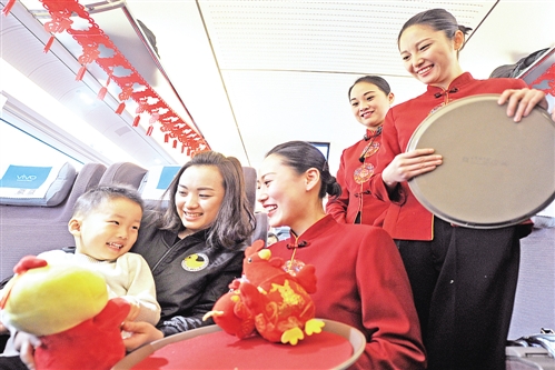在北京南开往天津的C2031次高铁列车上,津京车队的乘务员身着唐装,为旅客们送上“福”字、鸡年吉祥物及新春的祝福,让回家的旅途充满了浓浓的年味。 本报记者 翟天雪摄