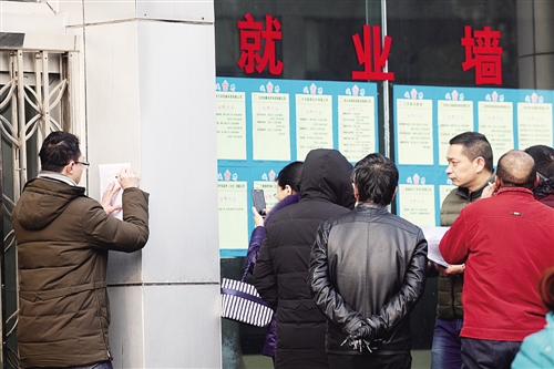 | 右图 2月3日,求职者在河南许昌市人力资源市场外的“就业墙”前查看就业信息。当日,许昌举办鸡年首场招聘会,当地100多家名优企业提供了家庭服务、普通工人、一线技工和业务销售人员等职位共5800多个就业岗位,鼓励返乡务工人员和大中专院校毕业生在“家门口”实现就业。 牛书培摄 |