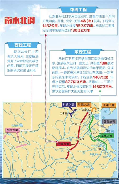 作为世界上覆盖区域最广、调水量最大、工程实施难度最高的调水工程,南水北调被规划分为东、中、西三线,分别从长江下游、中游、上游向我国北方地区调水。
