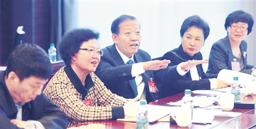 3月13日上午,人大黑龙江代表团在驻地分组审议两高报告。全国人大代表关彦斌(中)在发言时表示,要加强知识产权保护,促进企业创新发展。 本报记者 李景录摄