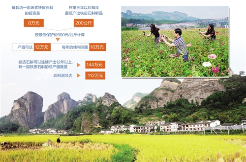 根据“铁皮石斛与铜皮石斛森林立体原生态栽培实用技术研究”项目组实验基地建设的经验,每栽培一亩床式铁皮石斛的投资是8万元,在第3年以后每年最低产出铁皮石斛鲜品200公斤,按与湖南龙石山公司签订的最低保护价600元/公斤计算,产值可达12万元,每年的纯利润是10万元。铁皮石斛可以连续产出12年以上,种一亩铁皮石斛的总产值就是144万元,总利润可达112万元。若在新宁发展栽培1000亩铁皮石斛,只要投资8000万元,3年后每年的产值就是1.2亿元,每年纯利润可达1亿元。
