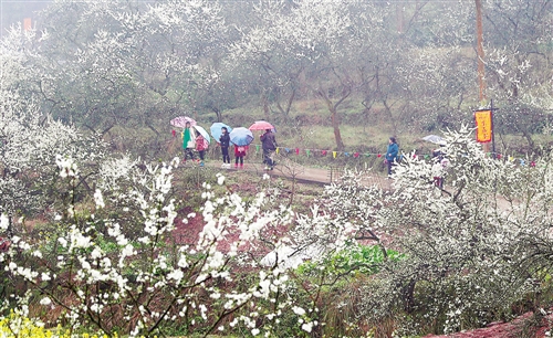 3月12日,游客在四川岳池县排楼乡龙井沟村观赏烟雨蒙蒙中的李花。素有“川东粮仓”之称的四川岳池县,因地制宜走农旅融合之路,不断拓展“赏花经济”,初步形成“春赏百花,秋闻稻香”格局。目前,该县近20万亩油菜花、桃花、李花及郁金香、虞美人等相继开放,吸引了众多游客踏青赏花。邱海鹰摄