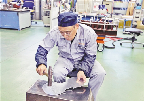 工厂培养了很多掌握独门绝活的工匠。说话间,老技师藤井洋征拿出一块平面葫芦形的铝板敲打起来,锤起锤落间铝板中心开始鼓起,周边回卷,一个三维球面部件开始成型,特别均匀,令人惊叹。