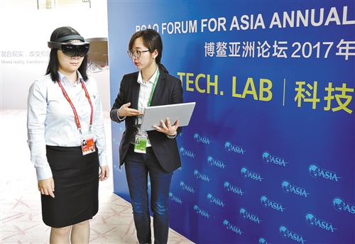 参加本次博鳌亚洲论坛的嘉宾在科技体验区体验微软公司的混合现实头戴式显示器HoloLens。