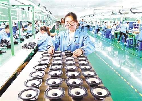3月24日,在江西安远县科迪科技电子有限公司生产车间,工人们正在生产电子元件。