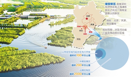 雄安新区规划范围涉及河北省雄县、容城、安新3县及周边部分区域,地处北京、天津、保定腹地,区位优势明显、交通便捷通畅、生态环境优良、资源环境承载能力较强,现有开发程度较低,发展空间充裕,具备高起点高标准开发建设的基本条件。雄安新区规划建设以特定区域为起步区先行开发,起步区面积约100平方公里,中期发展区面积约200平方公里,远期控制区面积约2000平方公里。
