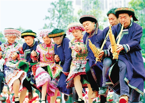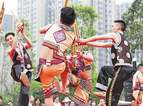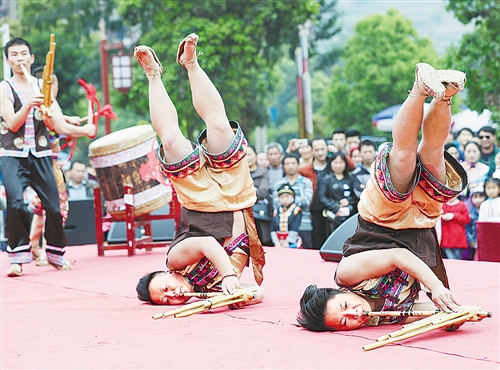 在四川省宜宾市兴文县苗族山花节期间,来自全国各地的苗族群众在该县花山公园举行挤芦笙比赛,吸引众多观众观赏。 挤芦笙是芦笙舞的一种,舞蹈动作跟随鼓点和乐曲连续旋转、矮步、倒立、翻滚等,节奏感强,舞姿优雅欢快。苗族群众通常在山花节等重要传统节日上舞蹈,青年男女也通过芦笙舞择偶。 新华社记者 江宏景摄