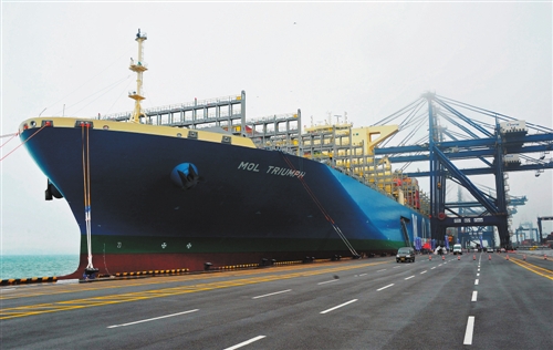 近日,全球最大的集装箱船“商船三井成就(MOL Triumph)”号轮靠泊大连港大窑湾二期集装箱码头。一季度,大连港完成货物吞吐量9400余万吨,集装箱量完成210余万标箱,均实现稳定增长。