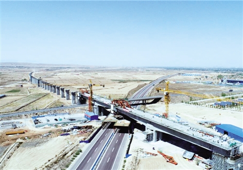右图 建设中的宁夏城际铁路首座跨定武高速公路连续梁立交特大桥。朱国才摄