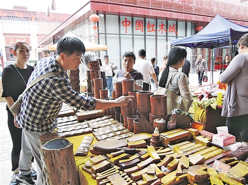 河北大城县“中国第一红木大集”日前开市,吸引了京津鲁豫等周边省市的游客前来选购红木产品。近年来,大城县大力发展红木文化产业,投资90多亿元建设红木文化新城。截至目前,大城县红木文化产业已拥有生产、加工和销售企业5000余家,从业人员约10万人,年产值超60亿元。陈彩燕摄