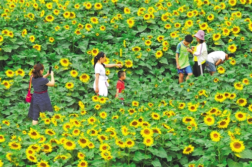 6月18日,游客在河南内黄县马上乡北菜村河坡地上种植的向日葵花海中赏花拍照。近日,内黄县马上乡北菜村农民利用河坡地种植的大片向日葵进入盛花期,吸引了许多游客前来赏花,在为农家带来经济收益的同时,也带动当地乡村旅游的发展。 刘肖坤摄