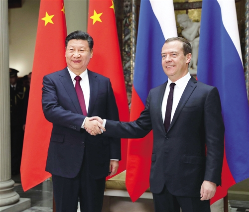 习近平指出,当前,俄罗斯经济发展持续向好,社会稳定。在全球经济增长乏力、国际贸易和投资低迷的形势下,中俄两国经贸、投资等领域务实合作持续扩大,成果丰硕。中国发展同俄罗斯合作的决心坚定不移,对同俄方一起应对全球挑战充满信心。中俄两国要坚持相互支持、相互开放、扩大合作,为两国共同发展振兴创造良好条件,为世界和平、稳定、发展注入强大动力。