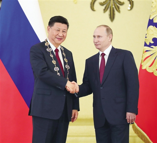 会谈后,普京向习近平授予俄罗斯国家最高勋章“圣安德烈”勋章。