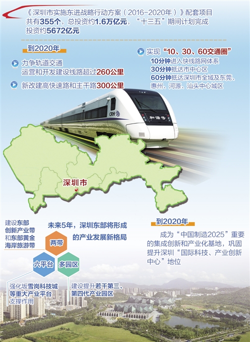 《深圳市实施东进战略行动方案(2016-2020年)》提出,从交通建设、产业提升、公共服务、城市发展四个领域推动发展要素、城市服务功能、创新和人才资源“东进”,带动深莞惠“3+2”经济圈和粤东粤北地区发展——