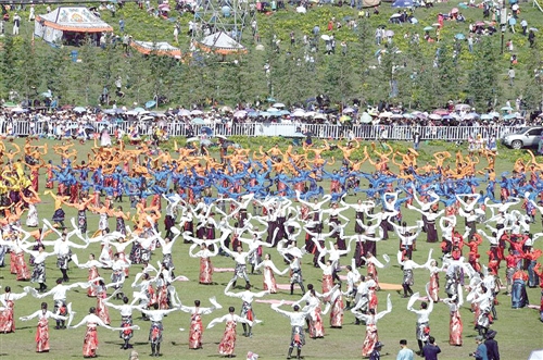 7月17日,1000余名甘南农牧民群众在当周草原跳起锅庄舞《吉祥甘南》。当日,第十八届中国·九色甘南香巴拉旅游艺术节在甘肃甘南藏族自治州当周草原开幕。在为期4天的节庆活动里,会举办大型文艺演出、千人锅庄舞、马队巡游表演、“藏域秘境”特色集市和篝火晚会、草地音乐节等富有藏族文化特色的活动,预计吸引10万多名民众和游客参与。