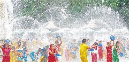 | ◀云南西双版纳傣族自治州傣族园游客泼水狂欢。 向中林摄 |