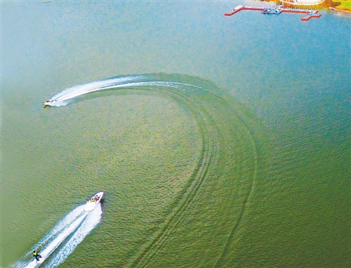 ▲重庆万盛经开区板辽湖,游客在此冲浪消夏。 曹永龙摄 |