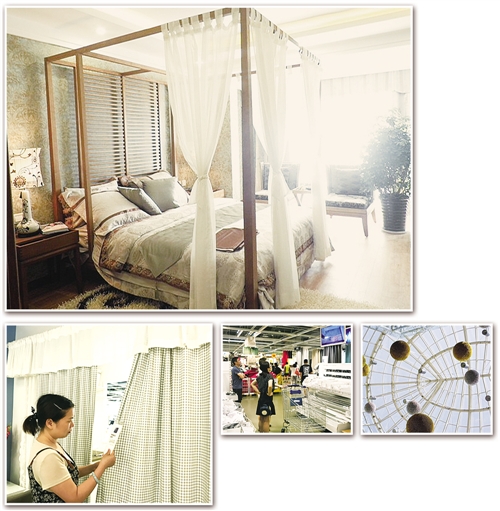 一边是窗帘的配件和挂样,一边是滚动播放的选购常识和安装提示,一站式采购方式吸引了不少消费者驻足。老李感慨:“以前买窗帘都是去市场先看款式,谈价格,再到家量尺寸,等安装,其中最费劲的就是砍价。如今到宜家,量好尺寸,自助选购,跟去超市购物一样,很省心。”