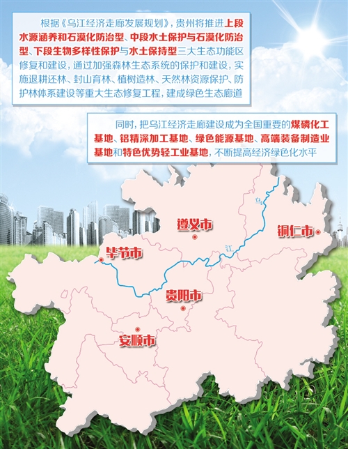 强化生态保护和修复。根据《乌江经济走廊发展规划》,贵州将推进上段水源涵养和石漠化防治型、中段水土保护与石漠化防治型、下段生物多样性保护与水土保持型3大生态功能区修复和建设,通过加强森林生态系统的保护和建设,实施退耕还林、封山育林、植树造林、天然林资源保护、防护林体系建设等重大生态修复工程,建成绿色生态廊道。