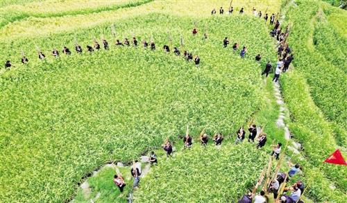 贵州从江县加榜乡加车村,苗族同胞在稻田里吹奏芦笙,庆祝丰收。近日,加车村举行“新米节”,当地苗族群众摆长桌宴,开展拦路迎宾、芦笙比赛、苗歌比赛等民俗活动,庆祝丰收,吸引十里八乡各族群众以及游客前来共度佳节。 近年来,从江县借助“加榜梯田”这张名片和民族节庆,大力发展乡村旅游,促进了当地农民增收致富。