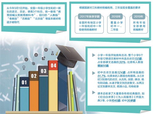 根据国家语文、历史、德育三科教材统编统用、3年实现全覆盖的要求,2017年秋季学期,全国所有地区小学一年级和初中一年级使用统编教材,2018年覆盖小学初中一、二年级,2019年所有年级全部使用统编教材。