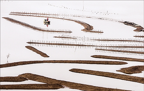 ◀点评:犹如神来之笔勾勒出自然轮廓。 水上甲骨文 刘开明摄 摄于福建霞浦县盐田畲族乡。 |