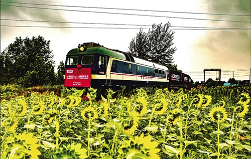 花海穿行 史家民摄 摄于山西侯马市。 ◀点评:列车穿行于向日葵花海之中,遍地金黄,尽收眼底。 |