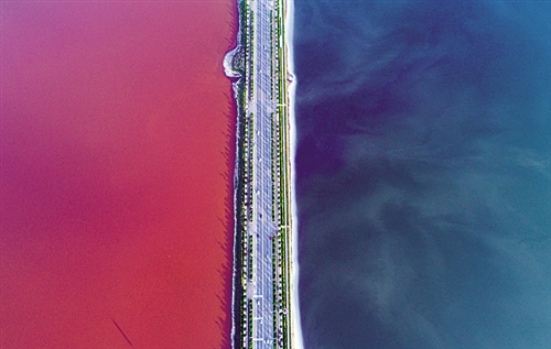盐湖鸳鸯 尚建周摄 摄于山西运城盐湖。 ◀点评:盐湖以公路为界,一红一蓝,展现自然神奇。 |