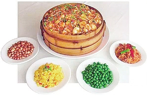 蒸笼粉鱼用竹篾编成的圆笼为盛菜器具,包含“合家团圆、吉庆有余”的寓意。做法并不复杂:先将鲜鱼肉切成薄片,拌好油盐等佐料备用,用水泡好的米粉丝(或鱼丝)先铺在蒸笼里放入锅中蒸熟,快起锅时再铺上鱼片,浇上一层生姜、辣椒、芝麻混成的调味汁,盖好蒸透,和竹蒸笼一起上桌。