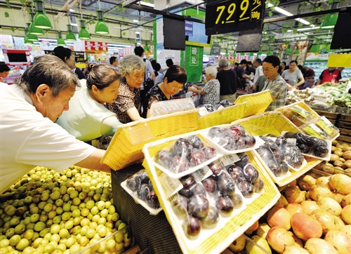 9月21日,市民在山东青岛市市南区一家大型超市内购买食品。临近国庆节和中秋节,市场供应充足。据了解,2017年初,青岛市市南区政府投资160万元启动了农贸市场、超市快速检测实验室改造升级工作,自检实验室每日开展入市食品快速检测,通过公示栏、电子屏幕等方式公示快速检测结果,便于消费者在选购食品时参考,同时通过自动程序上传食药局,用于数据分析和评估食品安全风险。
