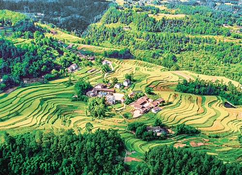 金秋时节,重庆市綦江区横山镇新寨村施家山,金黄的梯田、秀美的山川与漂亮的农家楼房交相辉映,构成一幅绚丽多姿的田园画卷。 陈宗武摄